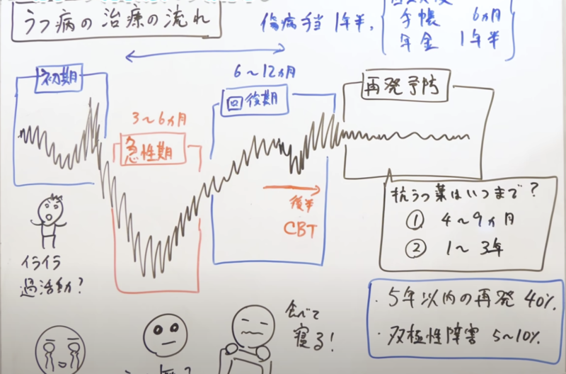 うつ病の回復・治療の流れは上記の動画がわかりやすい。動画を一部スクリーンショットさせてもらうと、下記のような流れですね。
