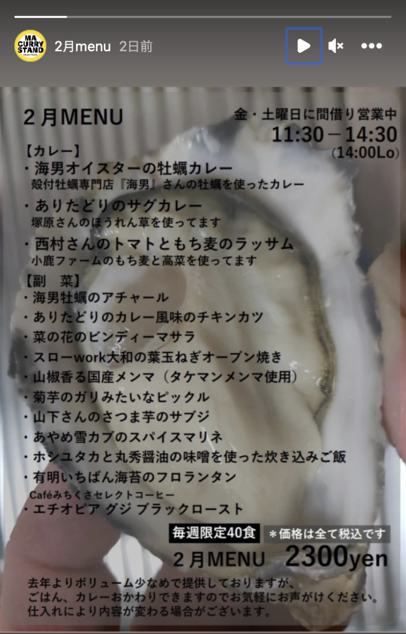 メニューはこちら。毎月かわるみたい。インスタをチェック!!