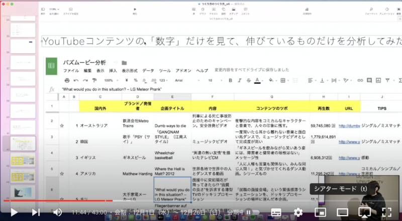 1_数字でつくる:ソーシャルメディアでいいねや、シェアが数字で可視化された。かわいい猫の動画が、巨匠がつくった制作費をかけた動画を凌駕する事例もでてきた。これはメディア環境によるもの。そうなったときに、今までクリエイターの主観で考えていた「おもしろさ」というものの判断ってどこまで正しいのだろうか?というのが最初に私が疑ったところ。逆に個人の主観というものを捨てて、客観的な数字が証明した数字を起点に考えたらどんなものが生み出されるだろうか?ということを考えてつくった「つくり方」ですが、何をしたかというと、当時出ていたyoutubeコンテンツというものの、数字だけ見て、伸びているものだけを分析してみた。