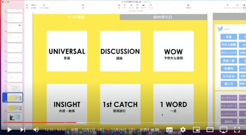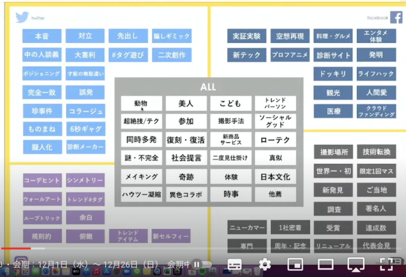 それ以外にも、全部入ってる訳ではないが「切り口」、こういう切り口だと広がりやすい、反応しやすいというもの。例えば先ほど話した猫。それが、ツイッターだとこういう要素、Facebookだとこういう要素といったように、メディア毎で少し切り口が違うことが言語化することでわかってきました。(事例でCClemonの忍者女子高生のCMがあるが、youtubeには違法アップロードのものしかないから掲載できず。viceでメイキングのインタビューあったので貼っときます。本編では映像少し解説されているので、見てみてください。)