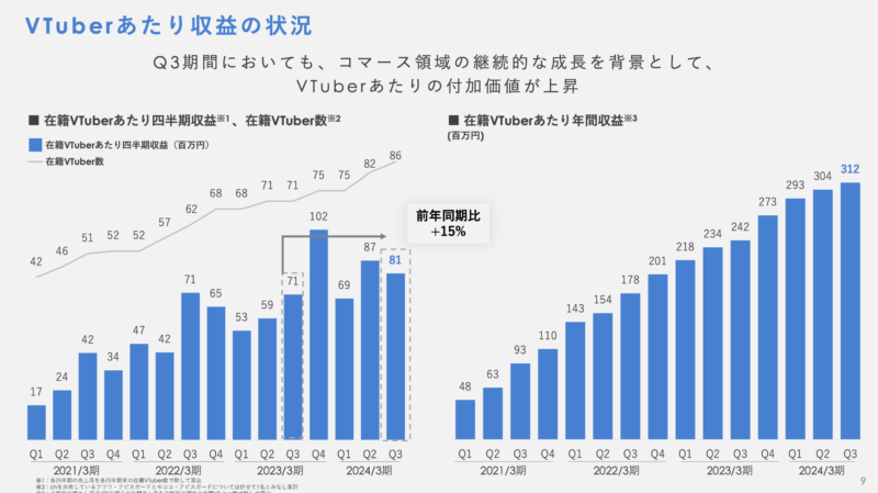 V Tuberあたり収益の状況。V Tuber一人当たりの稼ぐ付加価値が伸びていることがわかる。
