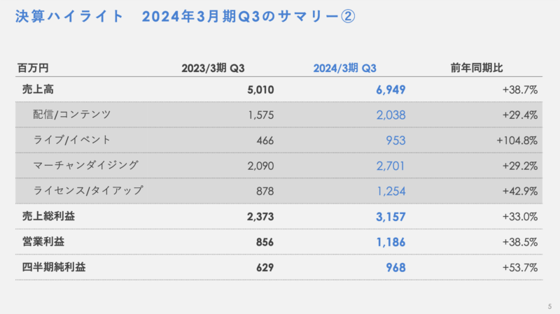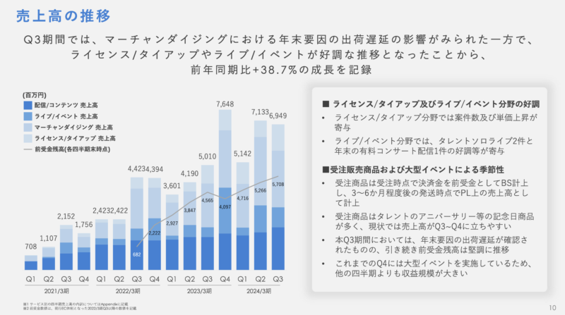 売上の中でも、マーチャンダイジング、配信/コンテンツ、ライセンス、ライブ/イベントの順で売上が大きいことがわかる。
