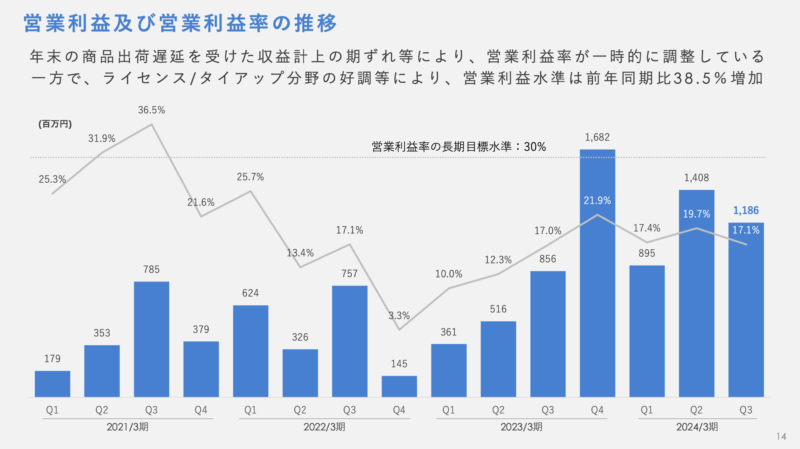営業利益、営業利益率。営業利益率の長期目標水準を30%と高い位置に置きながら、17%前後で近いところは推移。
