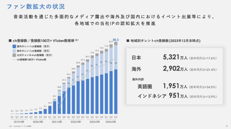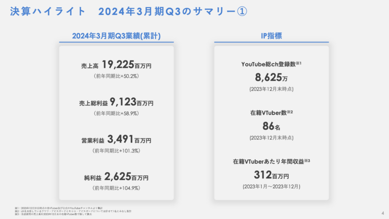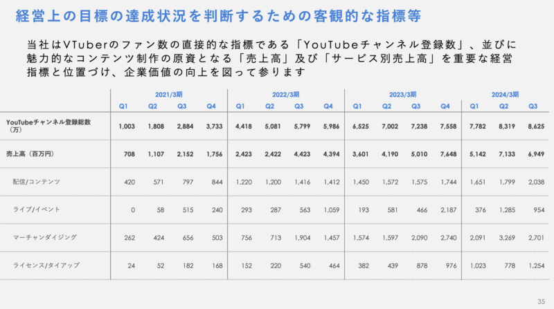 youtube総ch登録数が8,625万人、V Tuberの数は86人、1人あたりの在籍V Tuberの年間収益3.12億。売上と営業利益、純利益は添付の通りである。