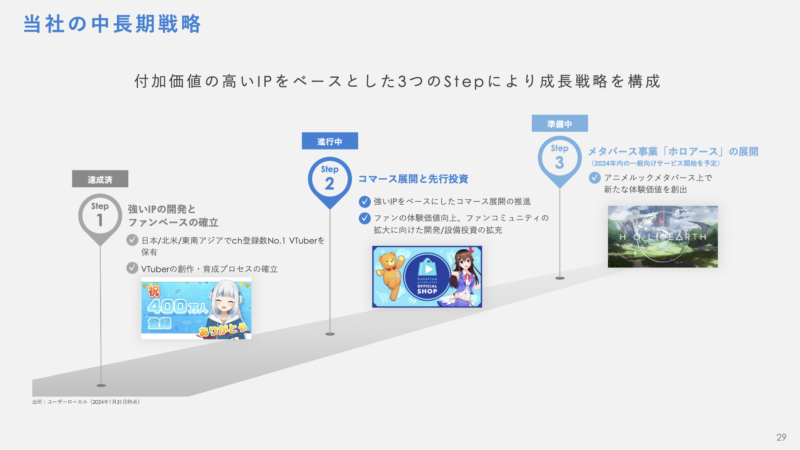 中期戦略。強いIPの開発とファンベースはある程度でき、ここからコマース展開にファンの体験価値向上、ファンコミュニティ拡大に向けた開発、設備投資の拡充を行い、メタバースの展開という流れのよう。