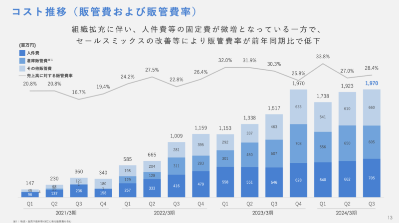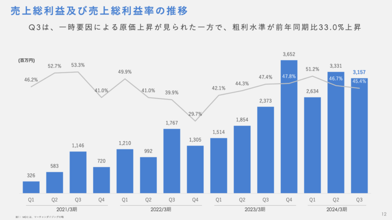売上総利益(粗利)は大体45%前後で推移しているようだ。金額は全体的に伸び傾向。