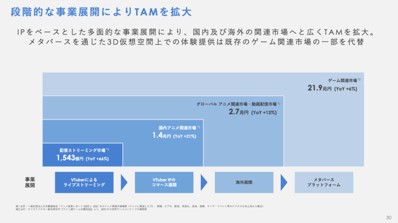TAMといいうのは、(total addressable market, total available market, TAM)獲得可能な最大市場規模、総獲得可能市場、アドレス可能な市場全体のことを言う。配信ストリーミングマーケットだけでなく、国内アニメ市場、グローバルアニメ・動画市場、ゲーム関連市場まで含めると、21.9兆円と大きなマーケットになる。ここまでマーケットを考えているということ。