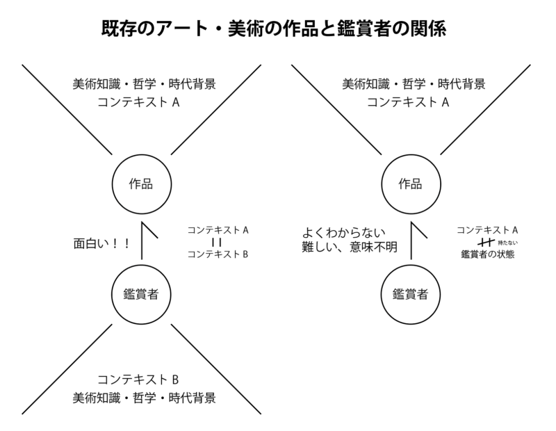 既存のアートや美術が難しいと言われている所以は、作品のコンテキストA、鑑賞者も知っておかなければならないという点。純粋に作品自体が視覚的に「好き」とか「嫌い」とかいうのは、表面的な判断としてあるかもしれないが、その作品が評価されているのには、作品のコンテキストAが影響していることが多いにあるということ。よって、左側の状態に鑑賞者がなっておく必要がある。コンテキストBを持ってない鑑賞者は、よくわからない、意味不明だという印象を受ける。何がすごいのかもわからないという風になる。