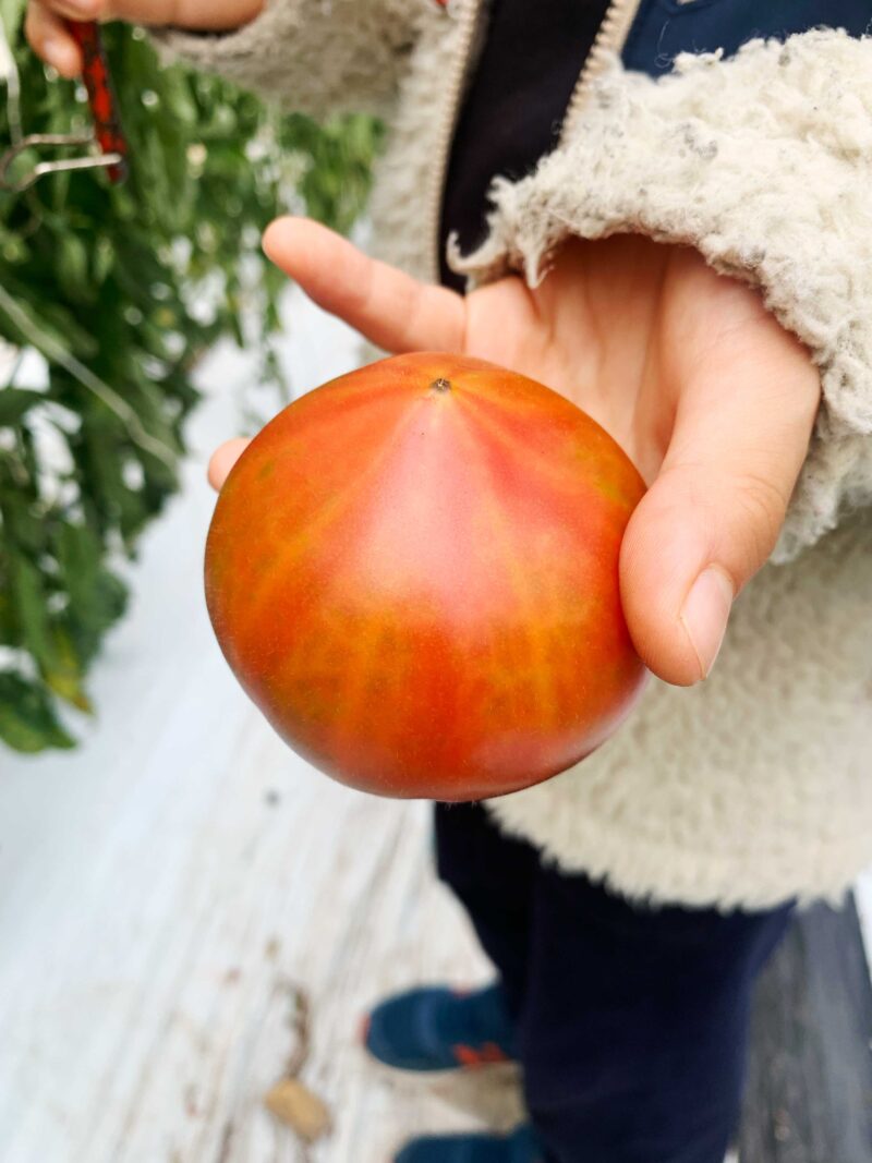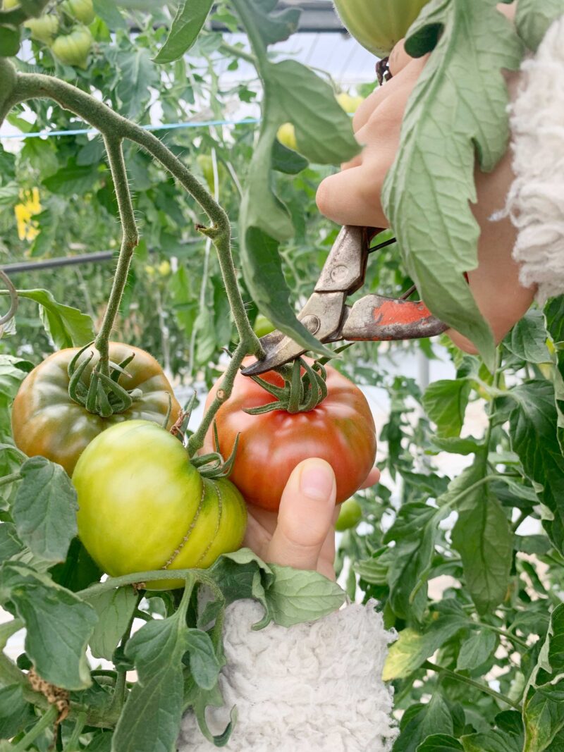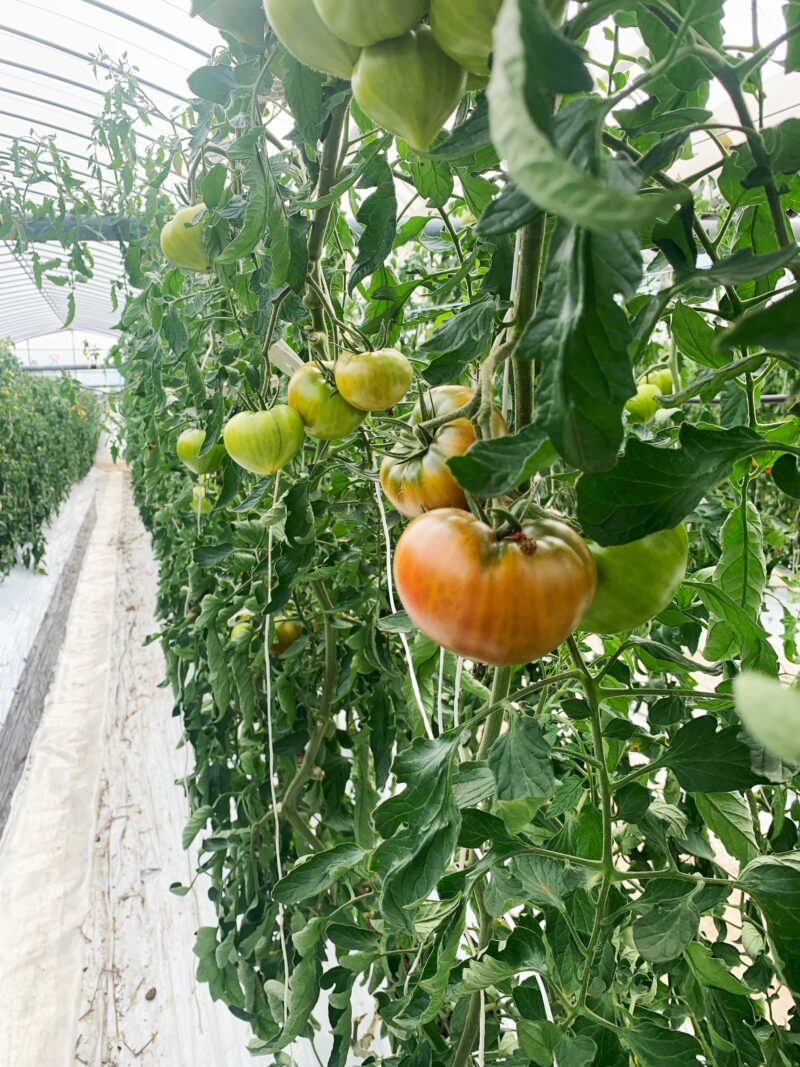 中には、トマトがずらっとー。赤いものもあれば、緑のもあるよ。