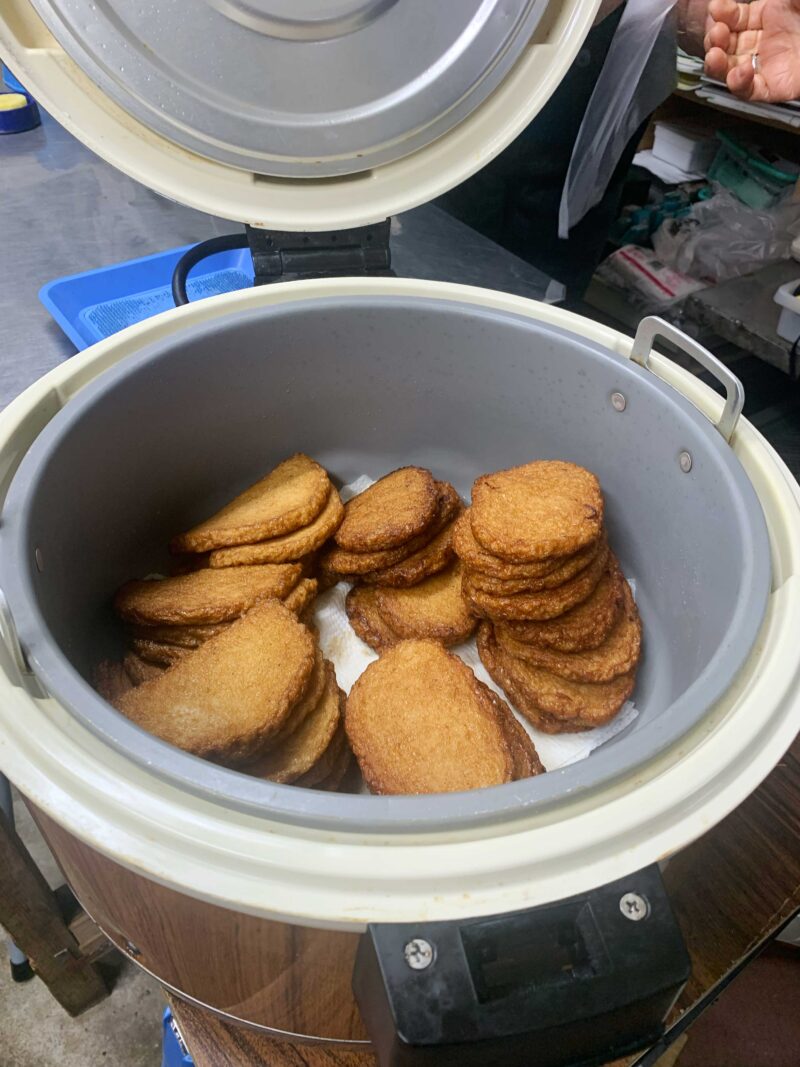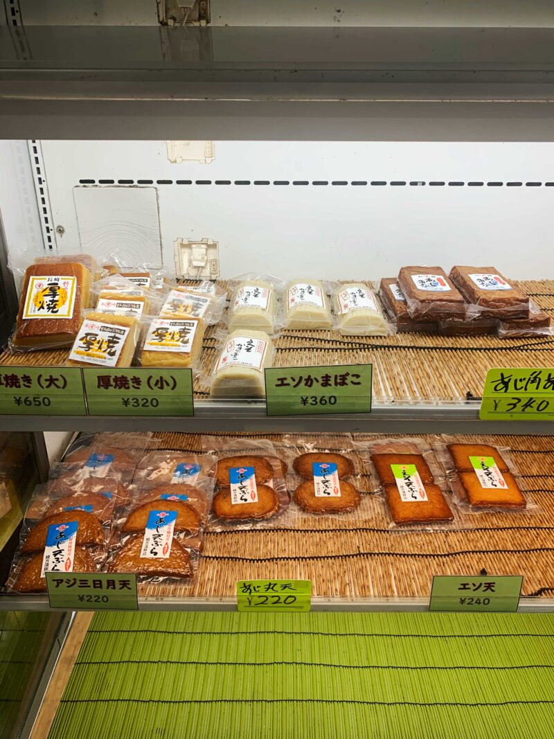 【長崎脇岬】緒方蒲鉾工場_てんぷら買い食い ごはん・喫茶記録 X Facebook0 はてブ0 LINE Pinterest コピー 2024.03.09 たまたま看板を見つけて入った天ぷらやさん。天ぷらとは魚のすり身の揚げのことだ。おばちゃんたちが「あげたてだよ〜」と対応してくれた。海のすぐそばで、アットホームなお店。 おばちゃんわさわさ あげたてだよ〜 いろいろあるよ。 べたなかんじがよい。 民家の一階でやってるよ。奥は工場みたい!!